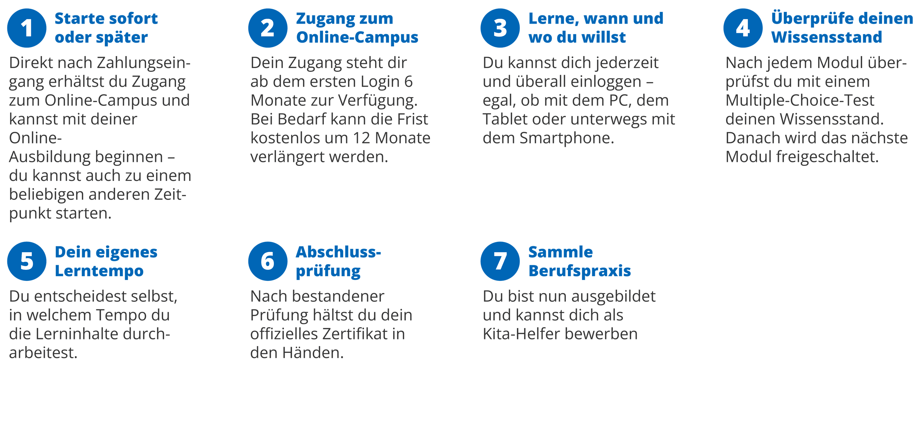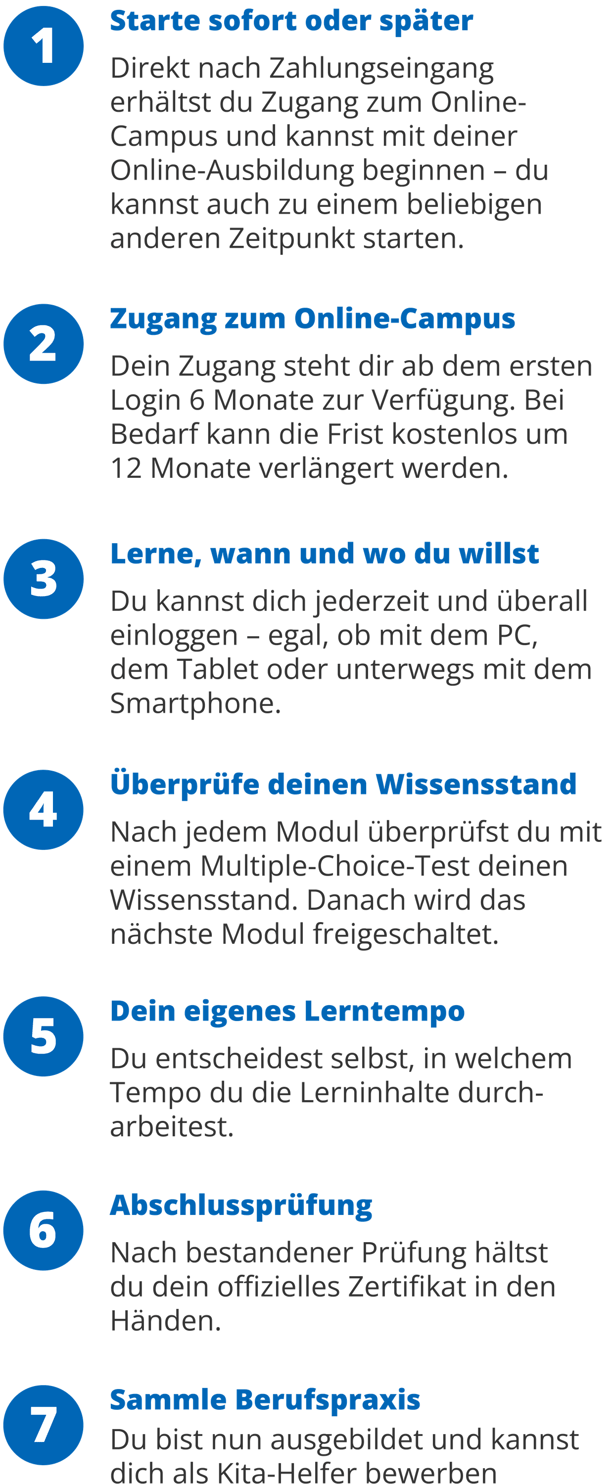 Der Weg dorthin ist stressfrei. Du bearbeitest die Module ganz flexibel in deinem Tempo. Es gibt kein „Pauken“ für ein Staatsexamen, sondern praxisnahe Wissens-Checks, die dich fit für den Alltag machen.